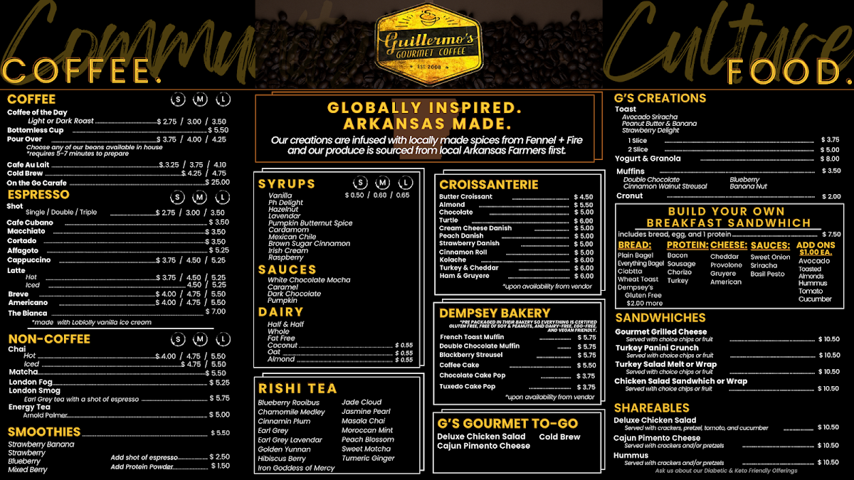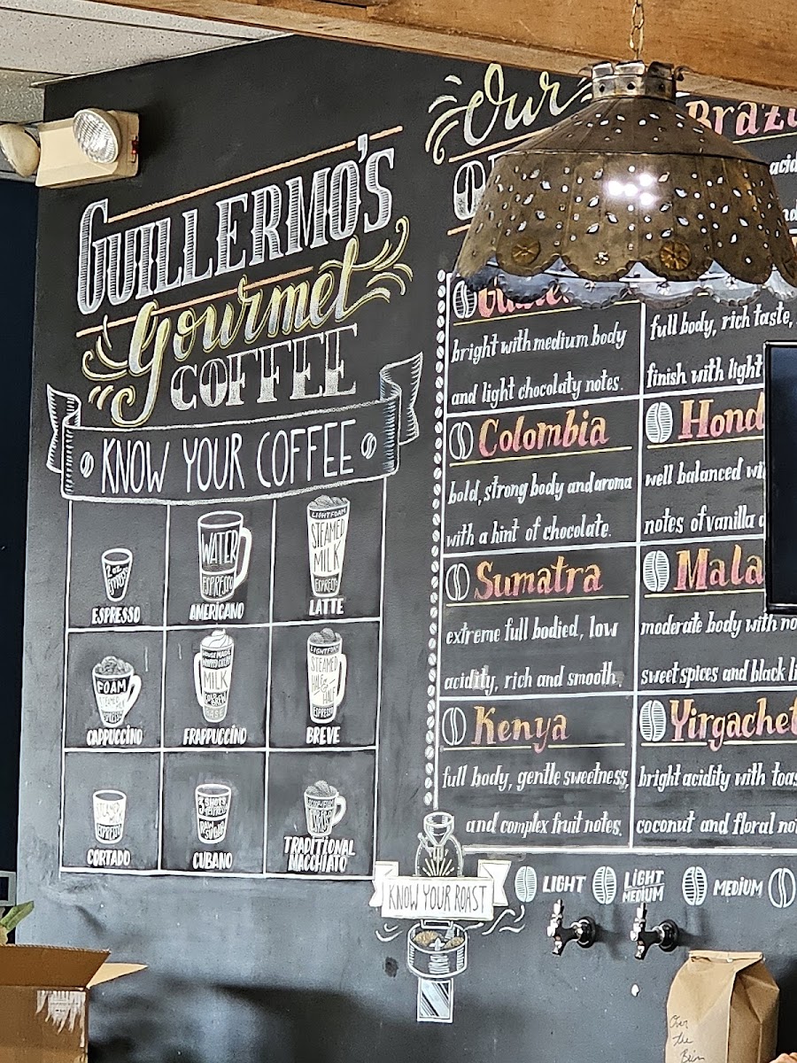 Guillermo's Gourmet Coffee offers a thoughtfully crafted menu that blends simple café favorites with carefully prepared casual bites. Whether you’re stopping by for a morning espresso or settling in with an afternoon cappuccino, the selection feels inviting and easygoing, perfect for a relaxed coffee break or a light, satisfying lunch.