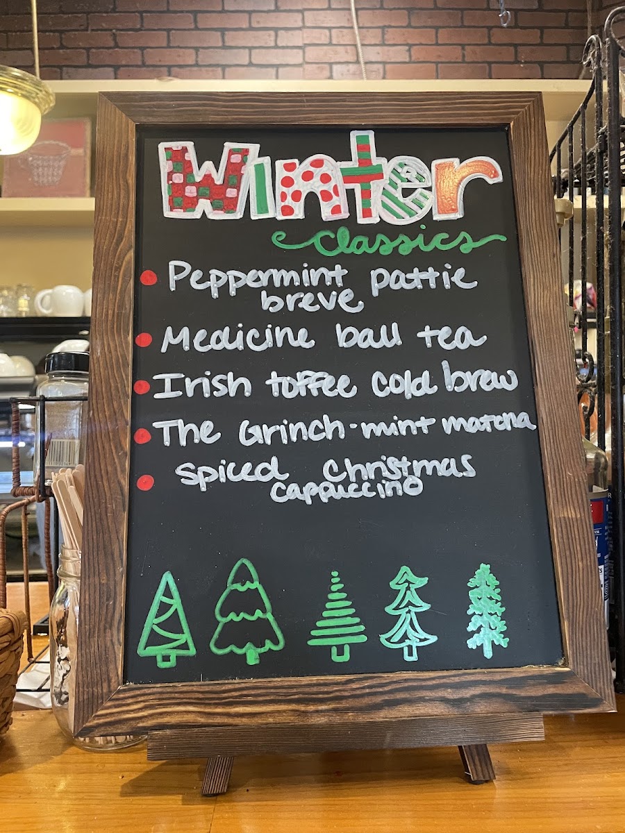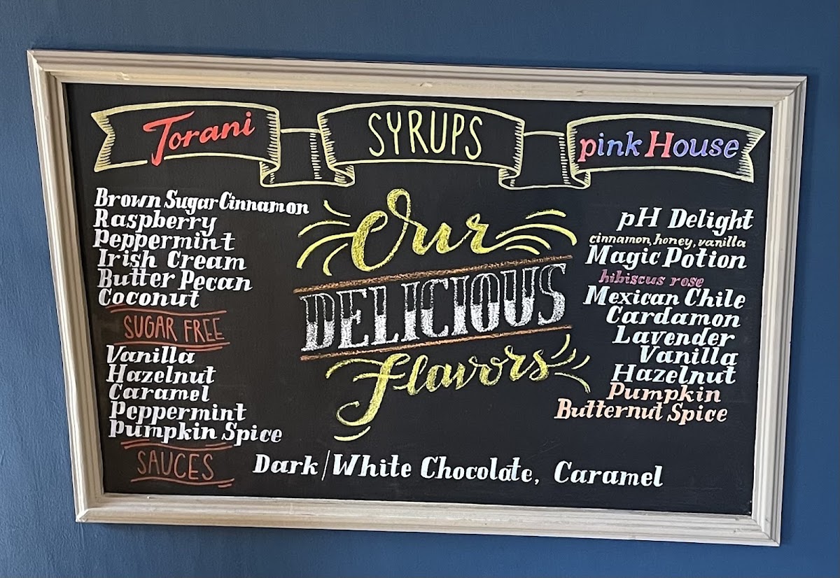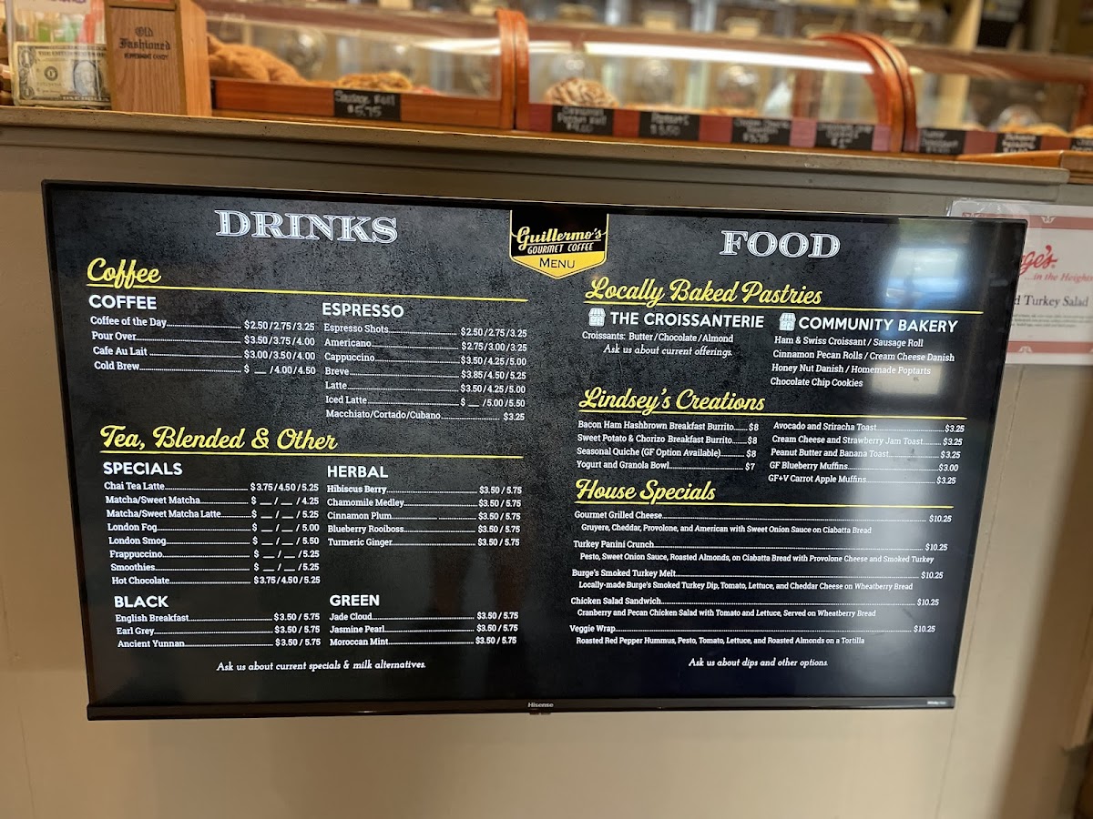 The menu highlights a variety of comforting drinks—from rich espresso-based choices like cortados and caramel frappes to a broad range of teas including matcha and chai. Alongside these, you’ll find handheld snacks like homemade poptarts, almond croissants, and a rotating variety of fresh sandwiches such as gourmet grilled cheese and turkey paninis. These pair well with fresh fruit or crisp chips, making them ideal for a quick yet thoughtful meal or a casual gathering.